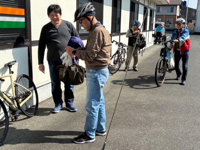 コースは佐鳴湖漕艇場(結構沢山の河津桜が近くで観られます。)の駐車場からスタートして、先ずは三方原台地の佐鳴湖公園まで登って早速無線交信開始です。この段階ではJA2PWU自転車星人とJR2FQKトド爺が無線で地元の無線家達にサイクリング立寄り場所や時間を広報してコマセを撒いてサイクリング会飛び入り参加者を募っているのが笑えます。早くもJM2INS局が昼食場所のカレーハウスに向かっていました。次に航空自衛隊浜松基地を時計方向に半周していると、左後方からボッシュ製の電動自転車で抜き去りTodoに手を振るJJ2AAAが途中参加してきました。走行中には早くもカレーハウスにJM2INSやJK2PHRが到着していると連絡が入って来ました。本格的インド人のカレーセットを食べながら談笑して再出発の光景が最初の写真です。次は倶楽部員のJR2BERがアンテナ工事をしたという友人JJ2ALVの壮観なアンテナを皆で鑑賞して5名の集合写真です。この時はJJ2AAAは道を誤って先に花見会場に向かっていました。
