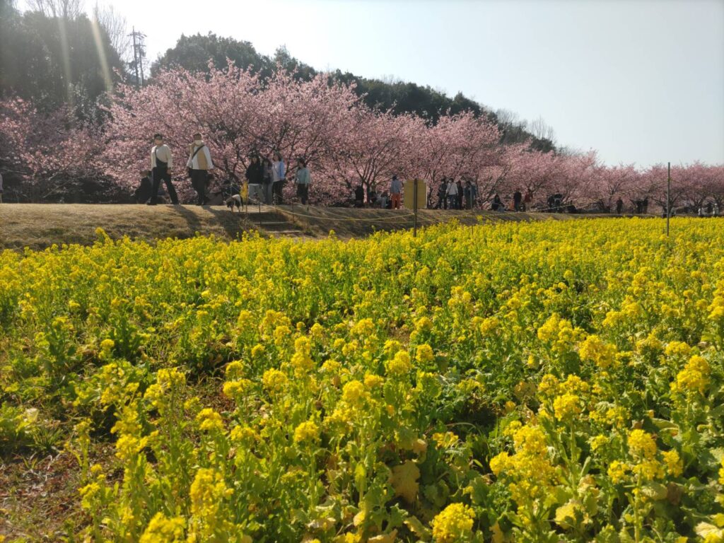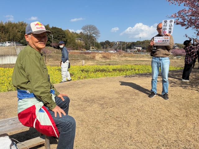 東大山桜は見事に7分咲以上で出店もあって花見客で大変賑わっていました。花川沿いの河津桜と付近一帯の菜の花畑のピンクと黄色が桜田附に錦糸卵の2色弁当のように明るい光景です。途中で結婚式の前撮り写真撮影をしている和服姿の新郎新婦も居て日本らしい光景です。途中堤防沿いのベンチに休憩してJK2PHRにはA4ポスターで無線広報をして頂きました。駐輪した橋の袂では、自転車から2.5Ⅿ伸びているアンテナが気になって小学6年生が来ました。どうやら昨年未来授業でTodoが訪れた和田小学校の生徒さんでしたので、3/28,29開催のCBT4アマ無料講習会の案内をしておきました。