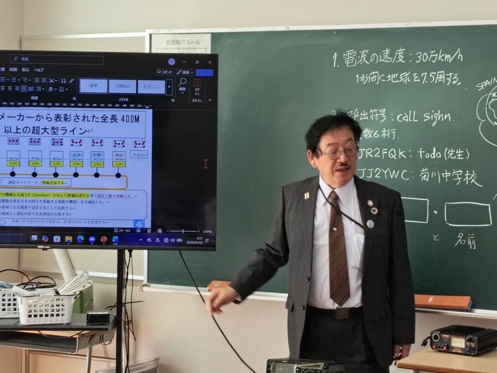 常葉大学付属菊川中学校は高台にあり尚且つ3Fの教室だったので電波の送受信環境としては申し分が無い。先ずは教室に入り三脚アンテナや無線機の設置及び大型液晶モニターとノートパソコンを設置して予め授業効率を考えて要点を事前に板書した。1時間目の生徒さんは女性も多かったです。生徒と名刺交換後は早速自己紹介で自動車生産設備の主にソフト設計職だった事を写真で紹介して、どんな事が役立ったかを話してみました。