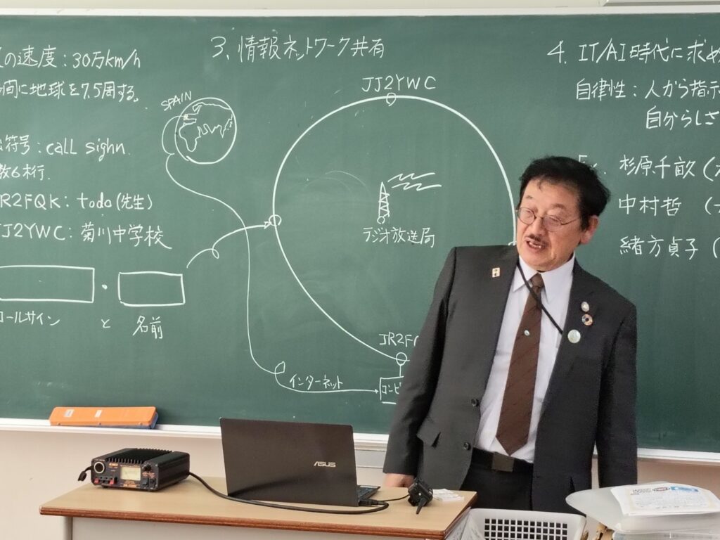 2時間目の体験交信では地元菊川市のJA2RWUさんがCQを拾ってくれました。RWUさんは高校時代に無線を始めて、沖縄と交信したり、海外の多国と交信が出来た事を紹介してくれました。生徒達は一体どこまで交信が出来るのか興味深々と言った様子でした。体験交信後は地球上の鏡の様に電波を反射する電離層利用の短波の交信例としてTodo爺のインターネット上に公開している交信記録を紹介したり、極超短波を使った宇宙通信の例として惑星探査機ハヤブサ2の話を出して何と3億K㎡離れていても電波で通信が出来る事を紹介しました。そして将来の技術者育成を考慮して身近な電波活用の例として車のナビの簡単な原理を説明してみました。実は電波は一秒間に30万㎞届くという事を応用しているだけでこんなことが出来ちゃうんだよとか説明すると、それなりに解ってくれて大変興味を持って貰えました。